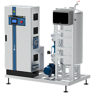 Planta de Ozônio Profissional tipo HYDRO VT, última geração, de 20 gO3/h, a 65 g/Nm3, 230V, 50-60Hz, 2 KW. Para a ozonização em linha. Inclui gerador de ozônio profissional com PSA e compressor, sistema de diluição com tanque, bomba e venturi. Controle por PLC e Redox.